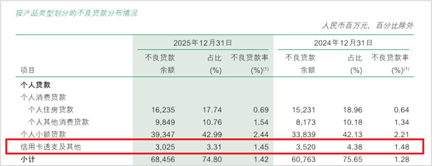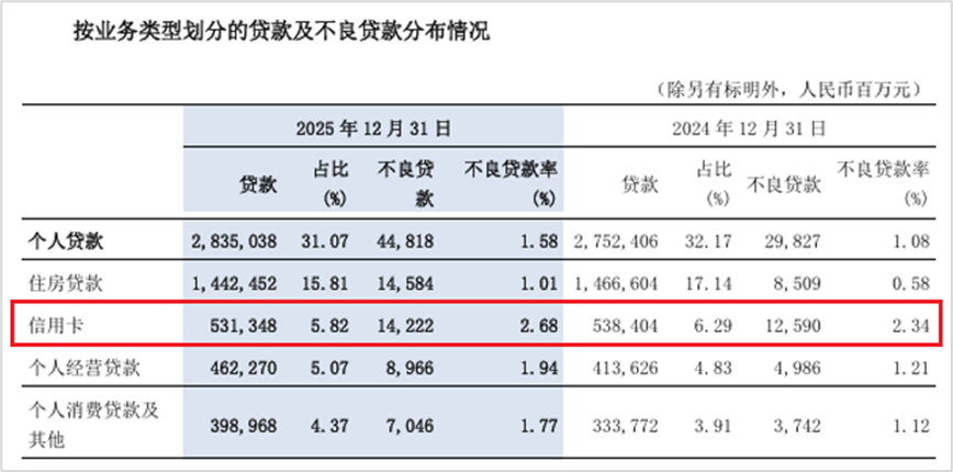 不良数据方面,2025年信用卡不良贷款106.11亿元,与2024年的102.72亿元基本持平;不良率2.18%,较2024年的1.73%有所上升。