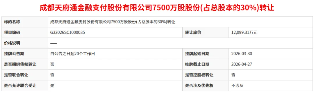 项目信息特别提示,天府通持有《支付业务许可证》,意向受让方提交申请时须书面承诺,符合《非银行支付机构监督管理条例》(国务院令第768号)、《非银行支付机构监督管理条例实施细则》(人民银行令〔2024〕4号)关于支付机构主要股东的资质条件。