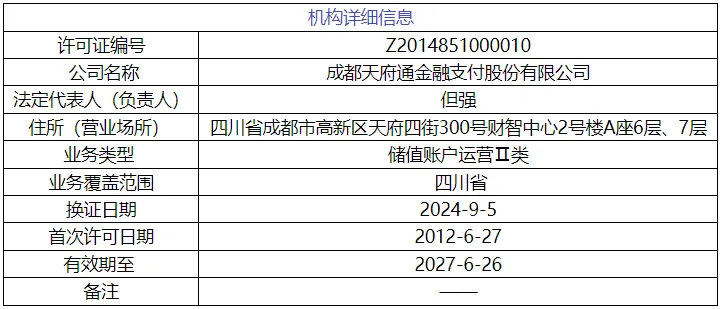 据移动支付网了解,天府通成立于2011年8月,次年获得人民银行颁发的《支付业务许可证》,具备四川省内预付卡发行与受理资质(现归类为储值账户运营(Ⅱ类))。