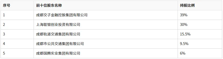 股权结构方面,成都交子金融控股集团有限公司持股39%,为天府通第一大股东;上海联银创业投资有限公司(简称“联银创投”)持股30%,为第二大股东;成都轨道交通集团有限公司、成都市公共交通集团有限公司、成都国腾实业集团有限公司等当地公共交通相关企业分别持股15.5%、9.5%和6%。联银创投为中国银联旗下创投机构,即本次天府通30%股权转让方。