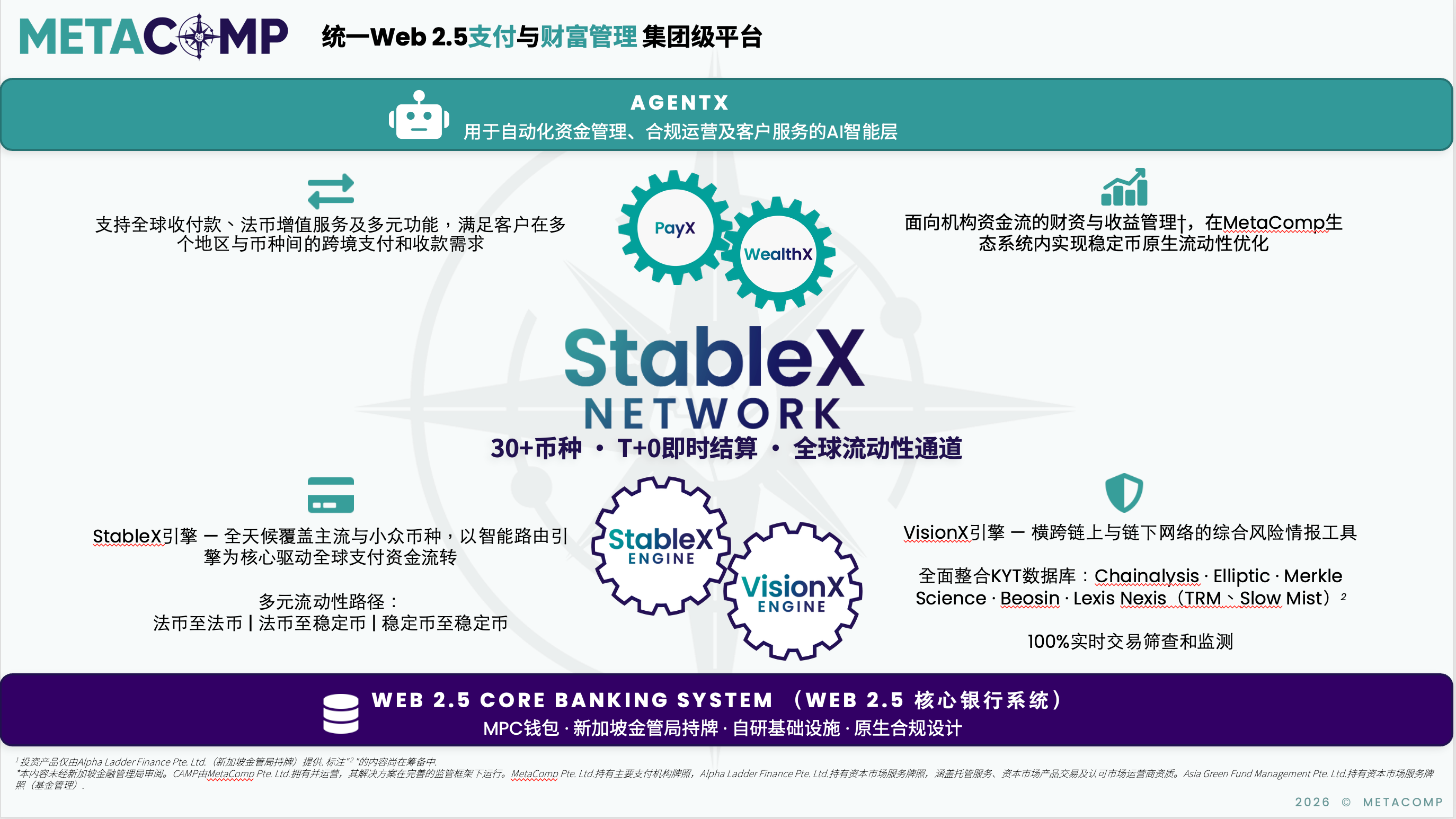 2026年3月27日,新加坡数字金融企业MetaComp(www.mce.sg)推出了针对性解决方案,并发布三大核心产品:Web2.5 VisionX Engine(合规智能引擎)、AgentX(AI原生金融技能架构),以及Know Your Agent(简称KYA,AI智能体专属治理框架)。