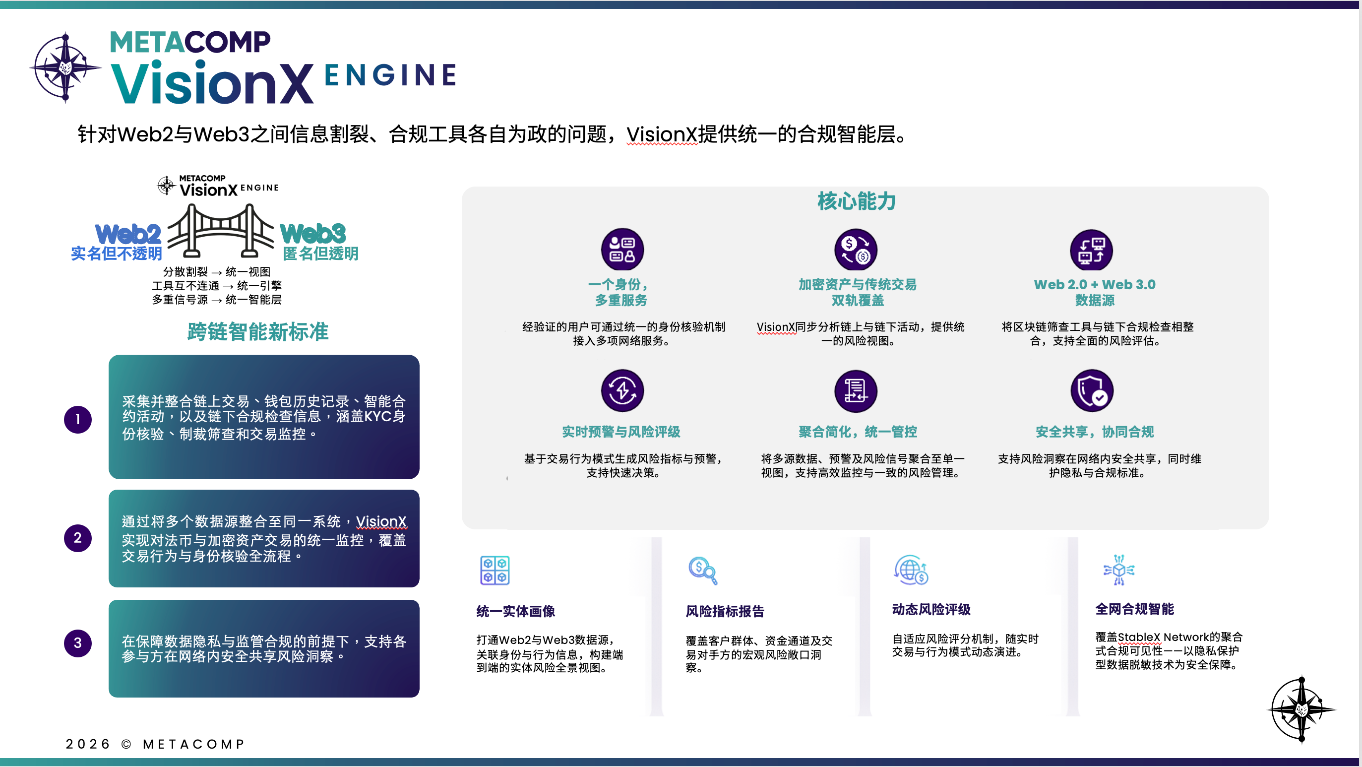 MetaComp正在成为智能体金融时代的核心合规基础设施,为链上、链下及各类AI智能体提供统一的风险控制与监管能力:一方面对接全球监管与多家区块链分析机构,另一方面以AI原生技能为载体,向企业与AI智能体开放标准化合规接口,实现合规能力的便捷调用与高效落地。