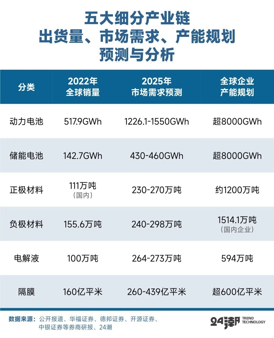 24潮产业研究院数据显示:截至2023年12月底,在动力电池、储能电池、正极材料、负极材料、电解液与锂电隔膜这6大核心赛道上,已知的企业产能规划均远超2025年第三方研究机构对市场需求的预测上限,未来三年内出现严重产能过剩似乎已不可避免。