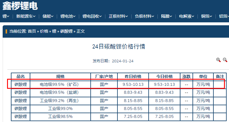 鑫椤锂电1月24日数据显示,电池级碳酸锂(矿石)报价9.53万-10.13万元/吨,与前一日持平。10万元会是阶段性的底部吗?对此,鑫椤锂电分析师钱艺向时代财经表示,预计支撑位在9万-9.5万元每吨。