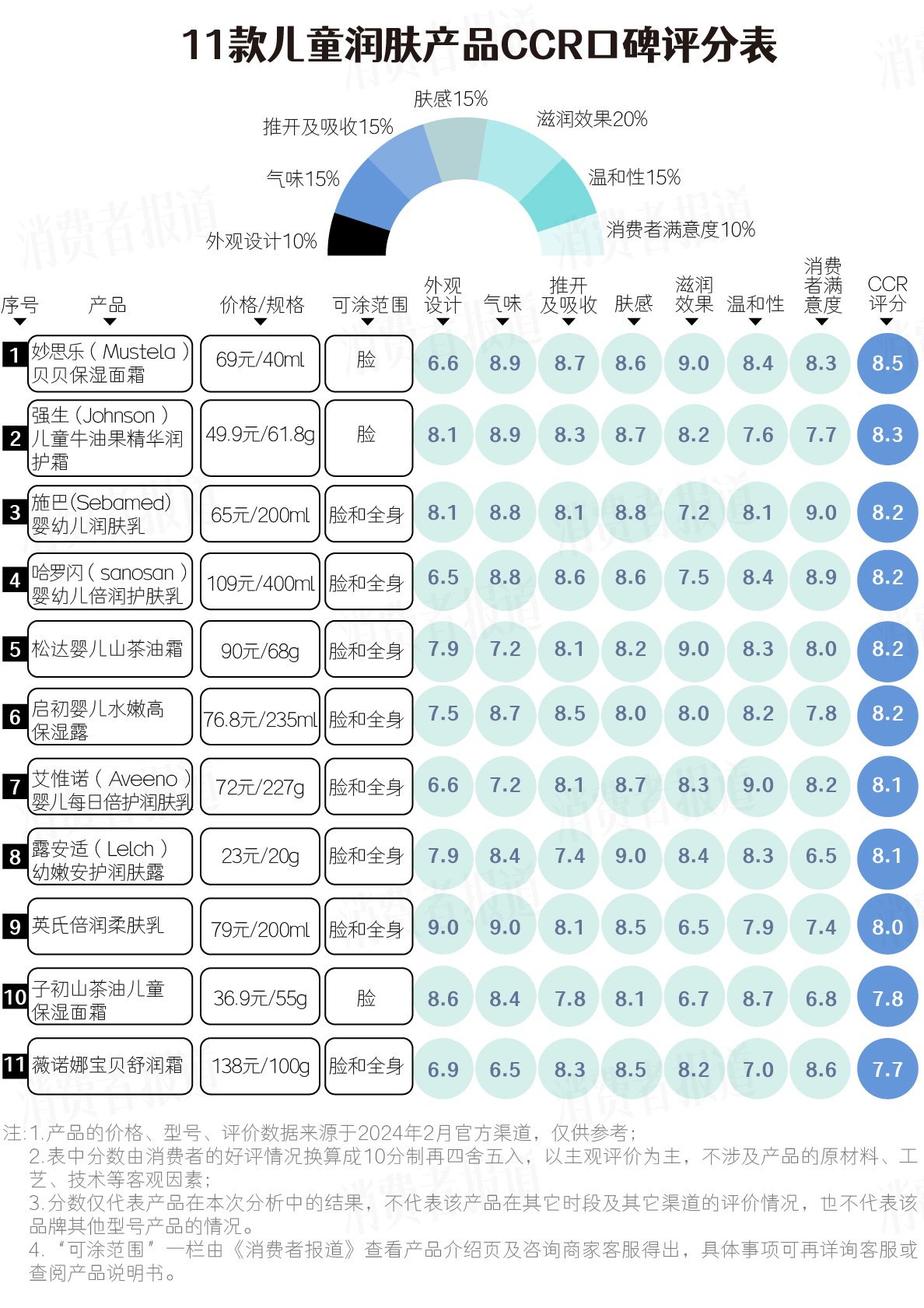 同时,口碑还根据润肤产品的特性,按重要程度给这七项指标赋予权重:外观设计10%、气味15%、推开吸收感15%、肤感15%、滋润效果20%、温和性15%、消费者满意度10%