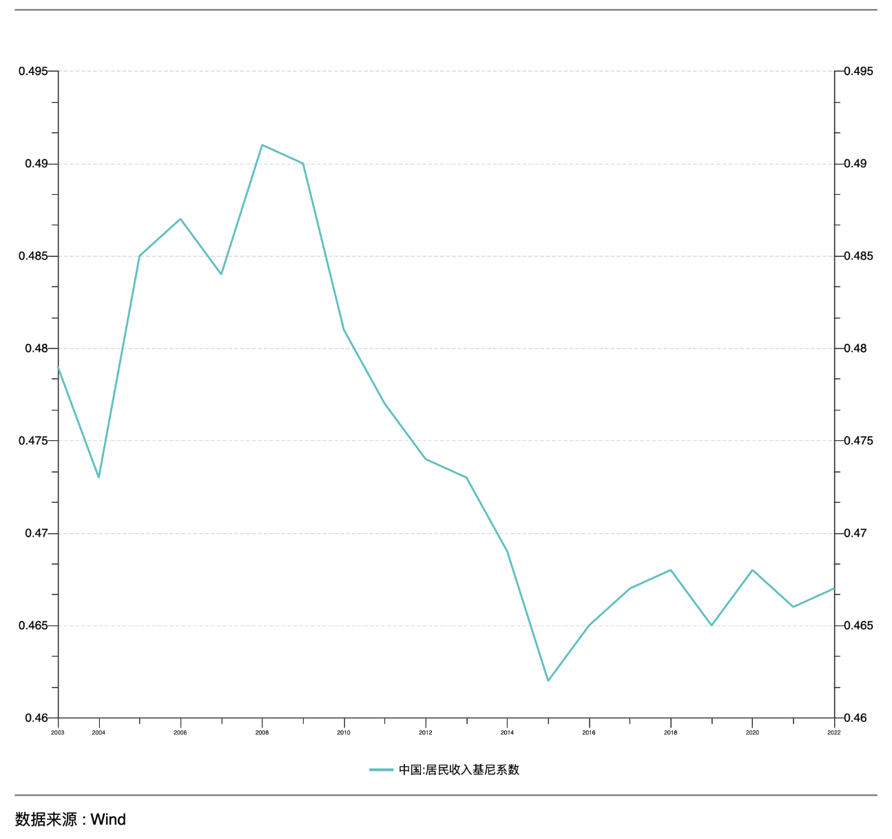 从趋势来看,我国基尼系数在经历了2008年-2015年的长期下滑态势后,于近几年略有反弹。2008年,我国基尼系数从0.491的高点开始逐年走低,2015年达0.462,为十数年间低点。但2015年后,基尼系数再度反弹,目前的最新数据显示,2022年末,我国基尼系数为0.467,较2021年高出0.001。