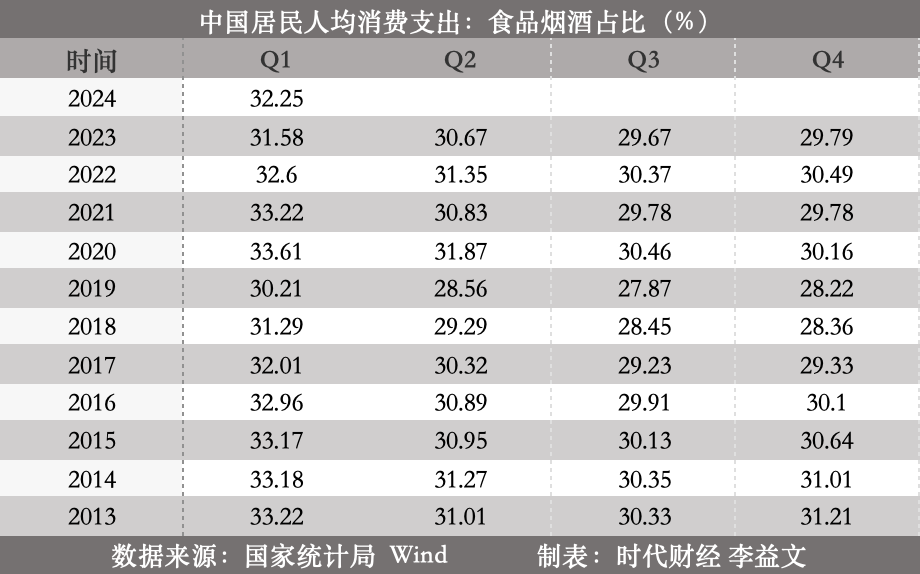 另一个需要注意到的是,2024年一季度,居民人均食品烟酒消费支出占人均消费支出的比重(即恩格尔系数)再度回升至32.2%,较2023年一季度的31.58%,高出了0.62个百分点。