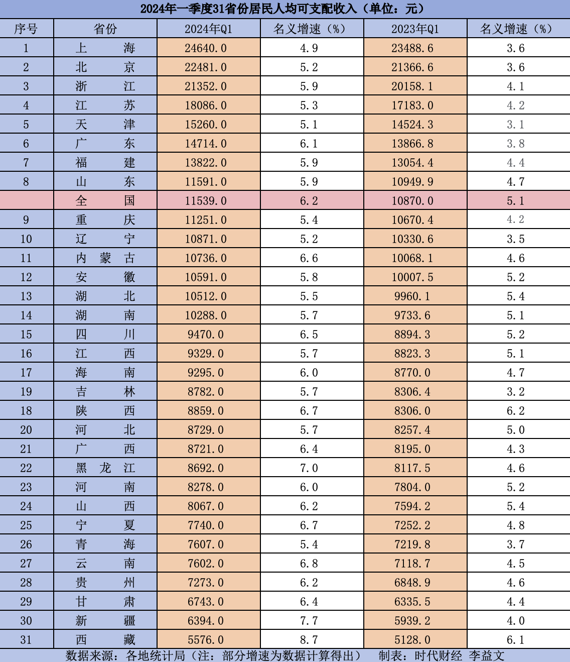 目前,31省份公开了2024年一季度居民人均可支配收入,3个省份在一季度迈入2万元大关。其中,上海继续稳坐榜首,一季度居民人均可支配收入达24640元,紧随其后的北京为22481元,浙江则继续以21352元位居第三。