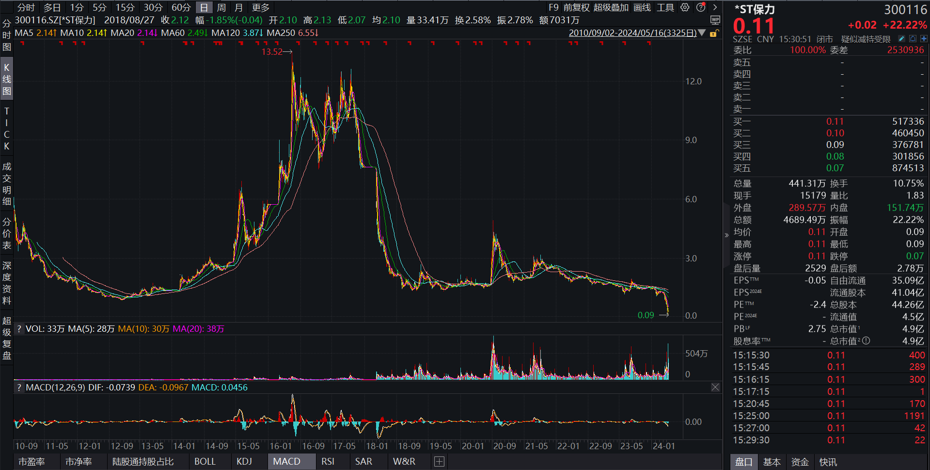 在此之前,*ST保力已经连续收获9个跌停。而5月16日,退市前最后一个交易日,*ST保力意外地涨停,涨幅达22.22%,股价定格在0.11元/股。