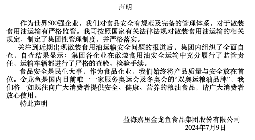 金龙鱼在7月9日晚间发布声明:关注到近期出现散装食用油运输安全问题的报道后,集团内组织了全面自查,自查结果显示:集团各企业在散装食用油安全运输中充分履行了监管责任,运输车辆都进行了严格的查验、检验手续。