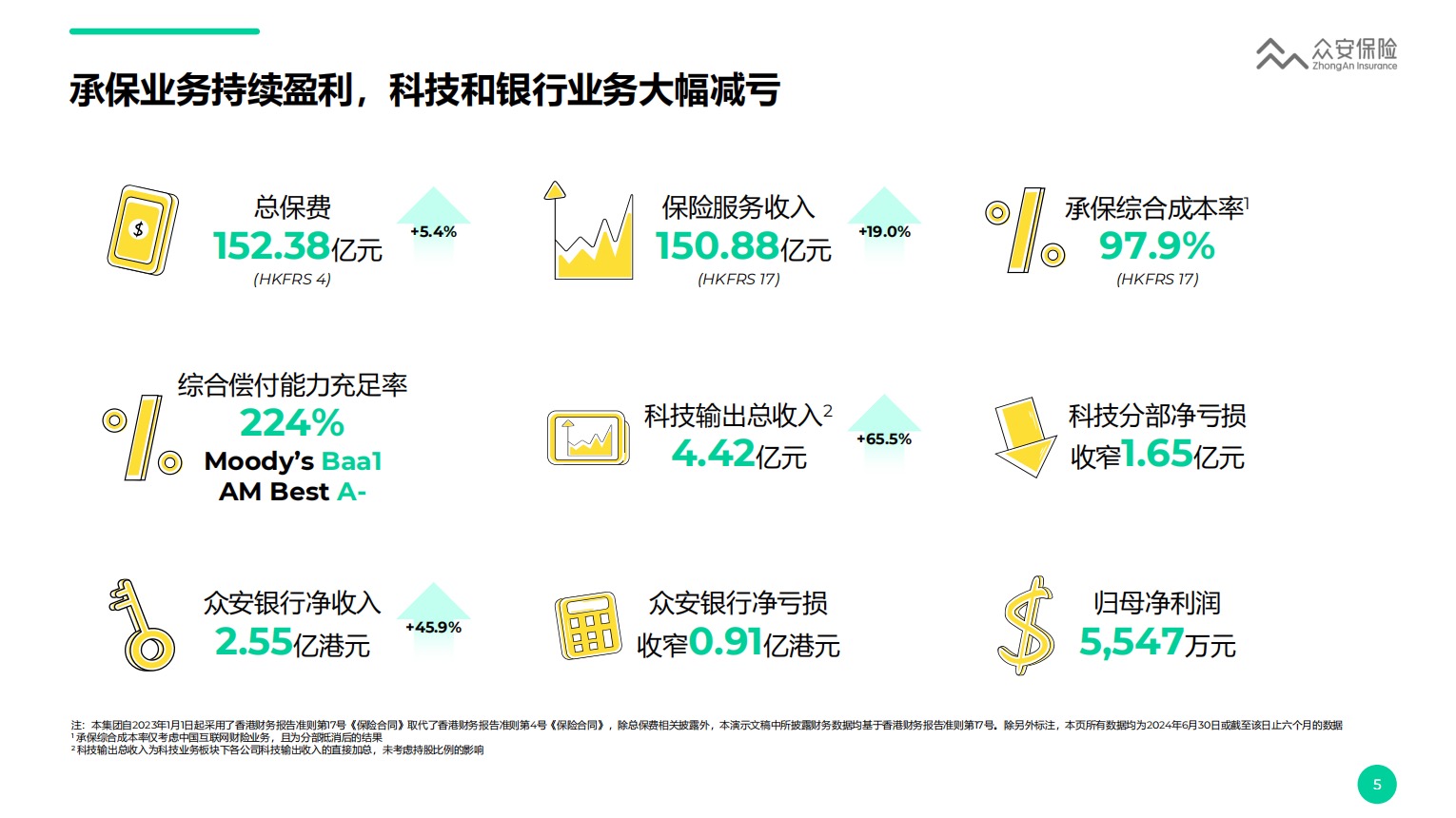 2024年上半年,众安在线的承保综合成本率为97.9%,较去年同期上升2.1个百分点。众安在线表示,主要由于综合赔付率上升3.6个百分点至60.7%,而综合费用率优化1.5个百分点至37.2%。