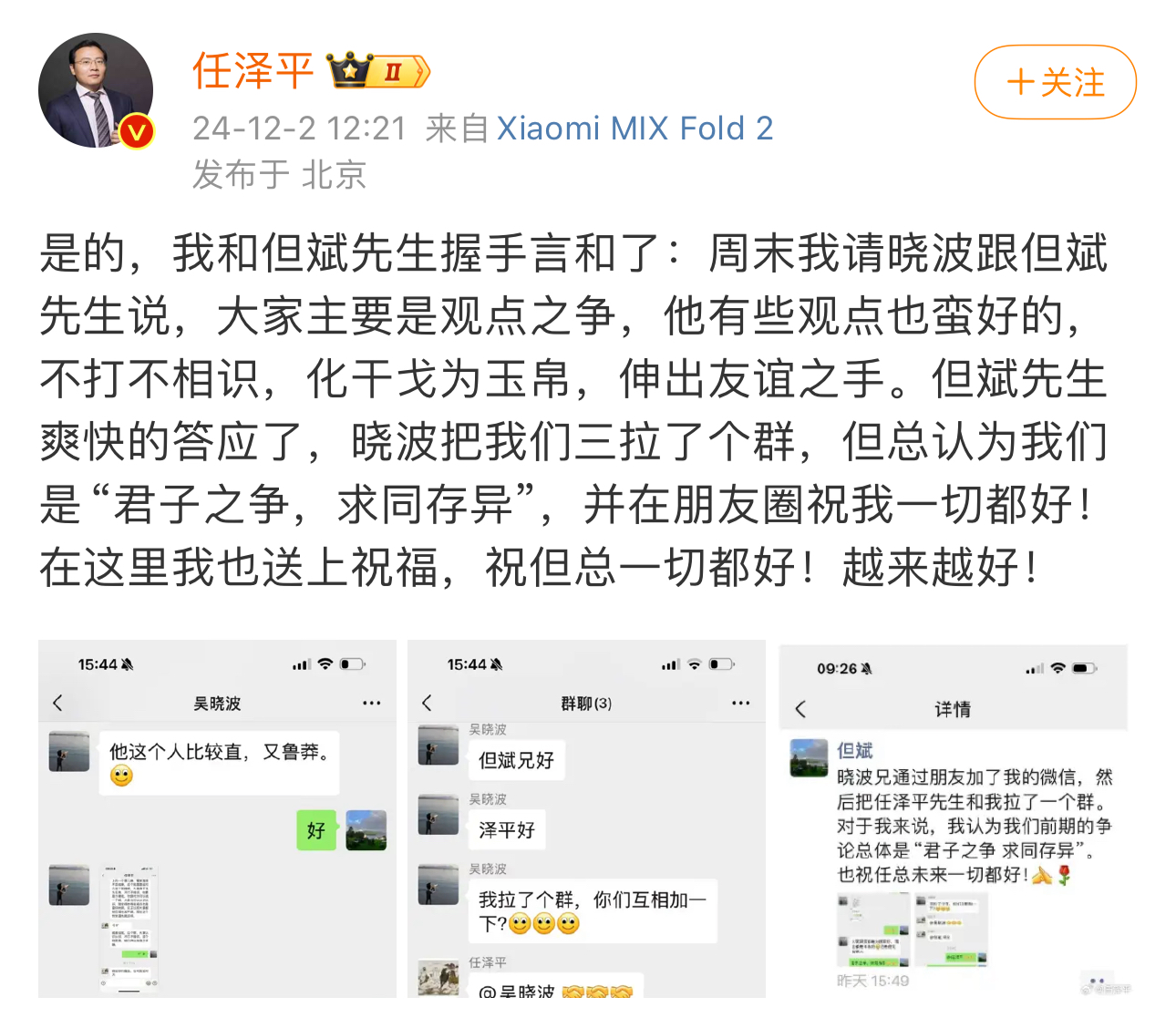 12月1日晚间,两张微信聊天记录在社交平台流传,聊天记录显示,吴晓波将二人拉到同个微信群中,但斌表示:君子之争,求同存异,任泽平回复:是的。2日,任泽平在微博做出回应:是的,我和但斌先生握手言和了。两位此前吵得不可开交的资本市场风云人物“一笑泯恩仇”。