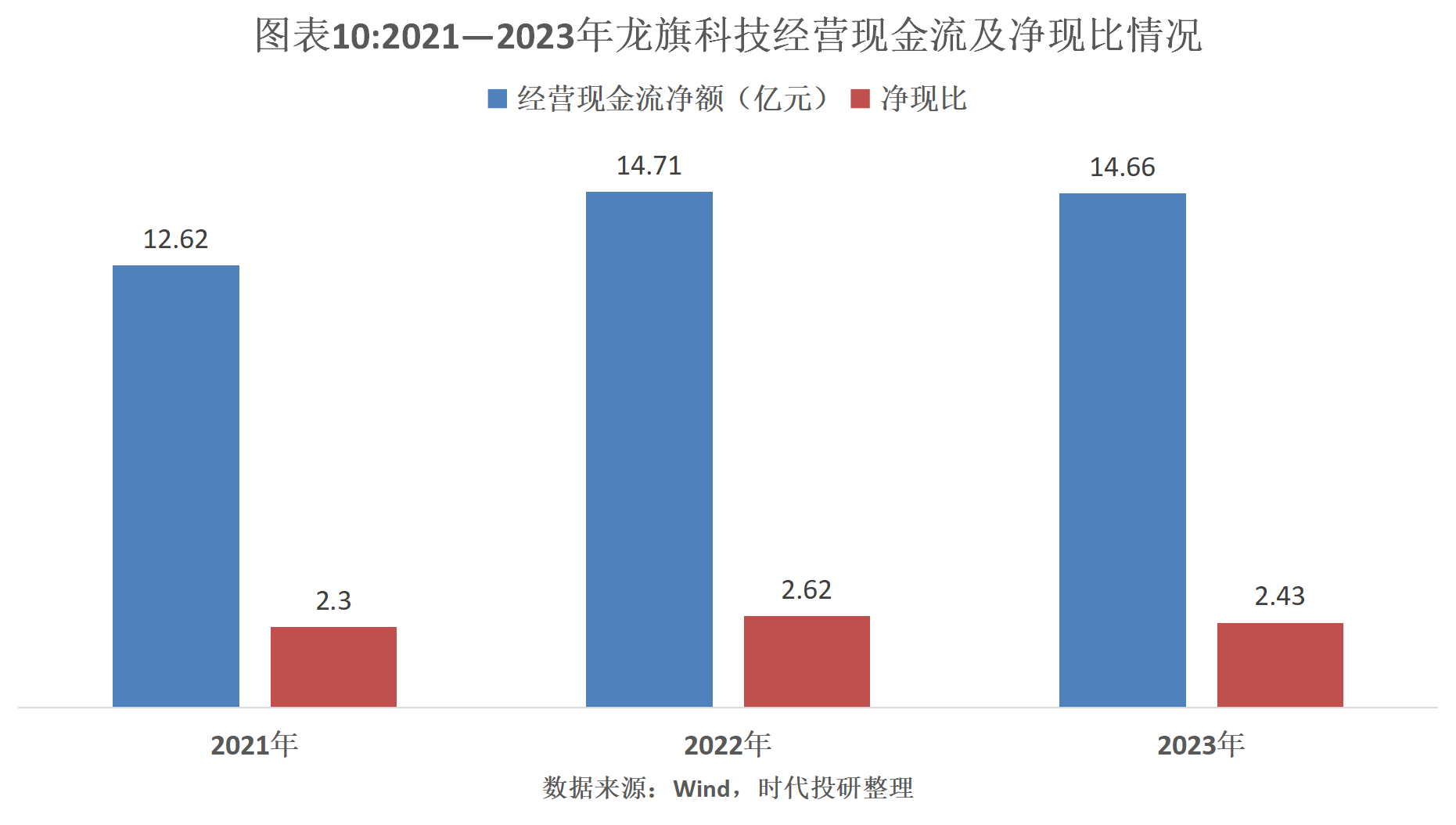 从现金流来看,报告期各期,龙旗科技的经营现金流净额分别为12.62亿元、14.71亿元、14.66亿元,规模在100只新股中位列第二,“造血”能力强。同期,其净现比分别为2.30、2.62、2.43,净利润“含金量”高。