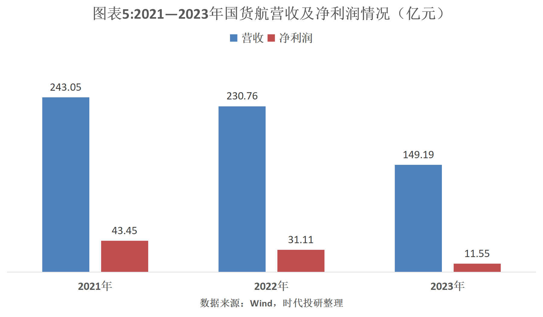 Wind数据显示,2021—2023年(下称“报告期”),国货航的营收分别为243.05亿元、230.76亿元、149.19亿元,年复合增长率为-21.65%;净利润分别为43.45亿元、31.11亿元、11.55亿元,年复合增长率为-48.45%。