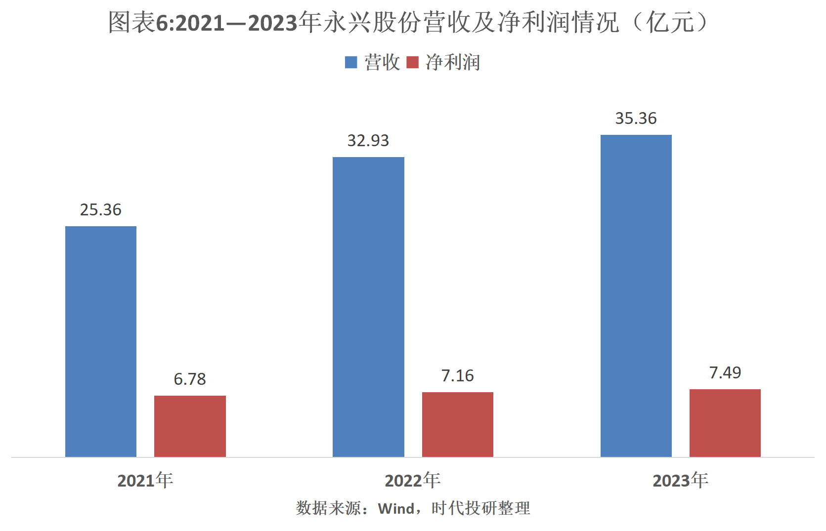 Wind数据显示,报告期各期,永兴股份的营收分别为25.36亿元、32.93亿元、35.36亿元,年复合增长率为18.09%;净利润分别为6.78亿元、7.16亿元、7.49亿元,年复合增长率为5.06%。