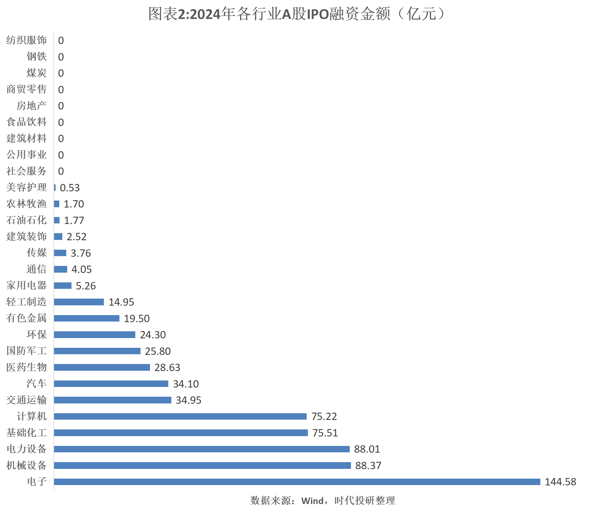 分行业来看,2024年电子行业(申万一级,下同)首发融资规模最高,达到144.58亿元,机械设备、电力设备行业紧随其后,融资规模分别为88.37亿元、88.01亿元。相比之下,在获得融资的行业中,美容护理、农林牧渔、石油化工分别以0.53亿元、1.70亿元、1.77亿元“垫底”。