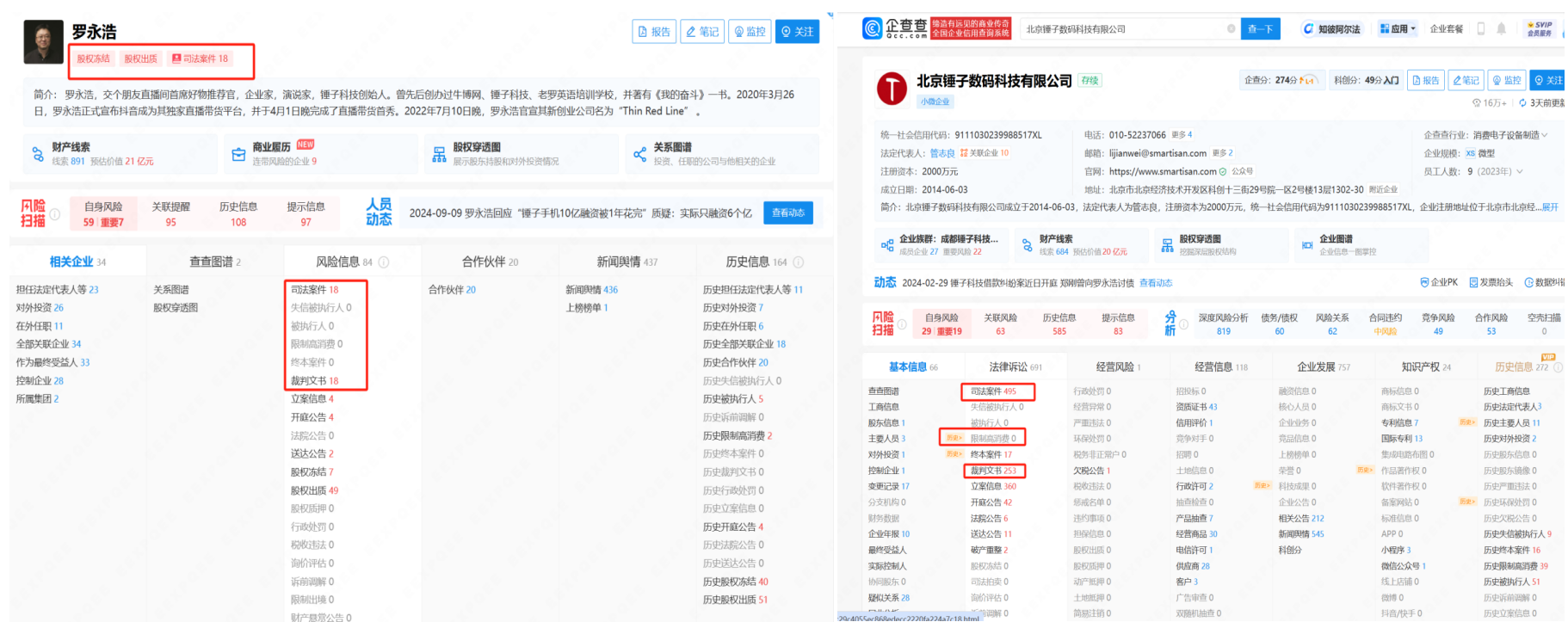 据企查查APP显示,当前名下涉及案件数量达495件,罗永浩名下因各类资金或合同纠纷产生的公开裁判文书记录共计18条,因向罗永浩追讨债务从而发起公开诉讼及有裁判文书记录的共计10家相关公司。而法院判决结果中,部分判决罗永浩限期偿还,部分则判决债务由公司负责,罗永浩无偿还责任。