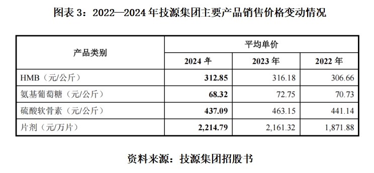 尽管技源集团曾表示其将通过调增HMB产品销售价格共同承担加征关税的影响,但时代商业研究院发现,2024年,技源集团三大产品均存在销售价格下降的情况,其产品的议价能力或并不突出。