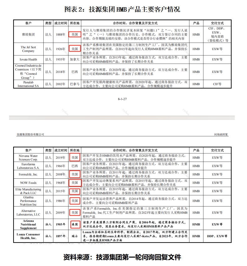 在第一轮问询回复文件中,技源集团披露了HMB产品的重要客户名单,其中有9家为美国企业。此外,技源集团氨基葡萄糖产品有4家美企客户,硫酸软骨素产品则有2家美企客户。