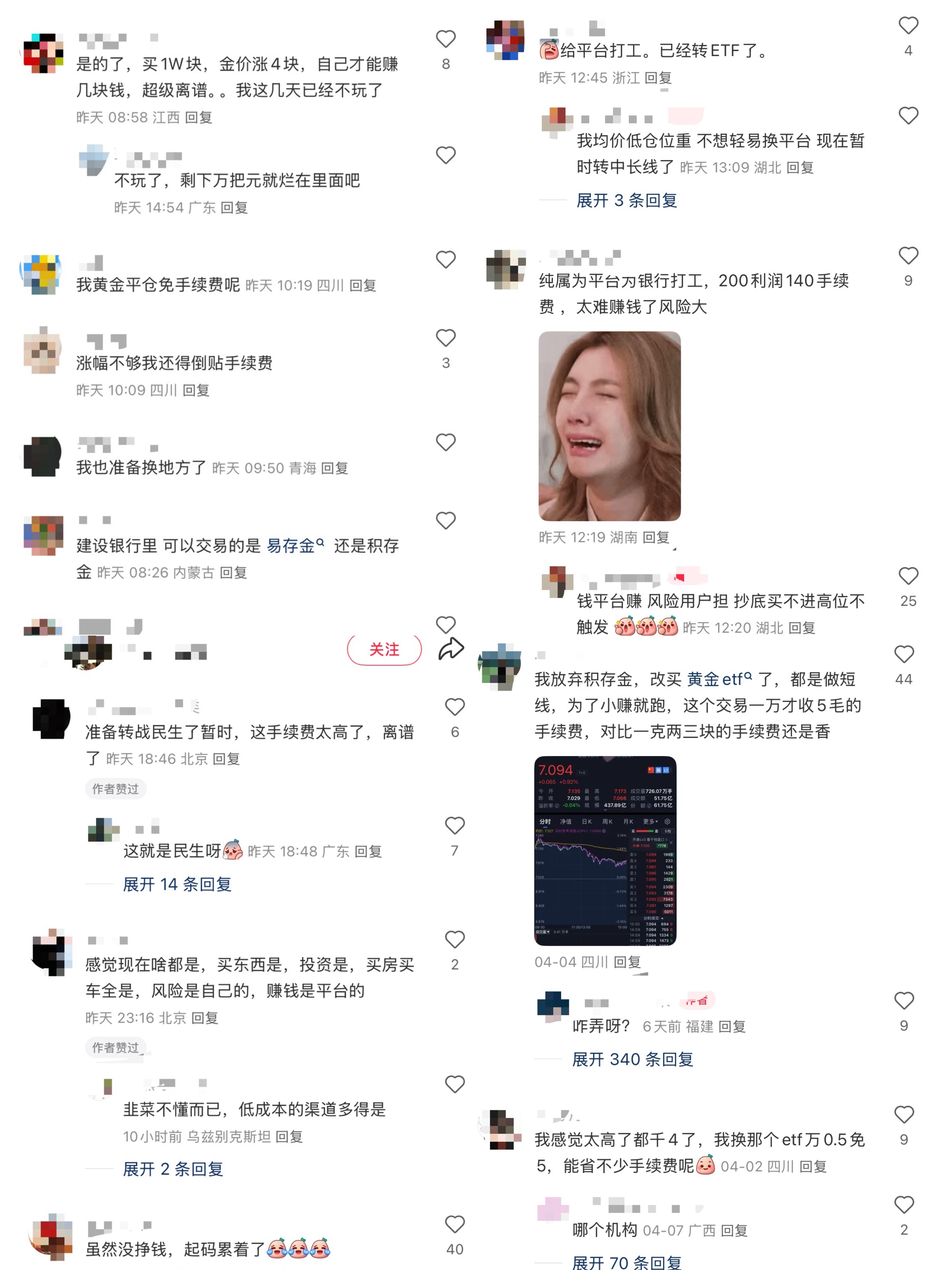 为此,许多投资者在社交平台上呼吁银行等机构降低黄金交易手续费,“再不降手续费,我就要转战场内黄金ETF了”“手续费太贵,收益都给平台了”。