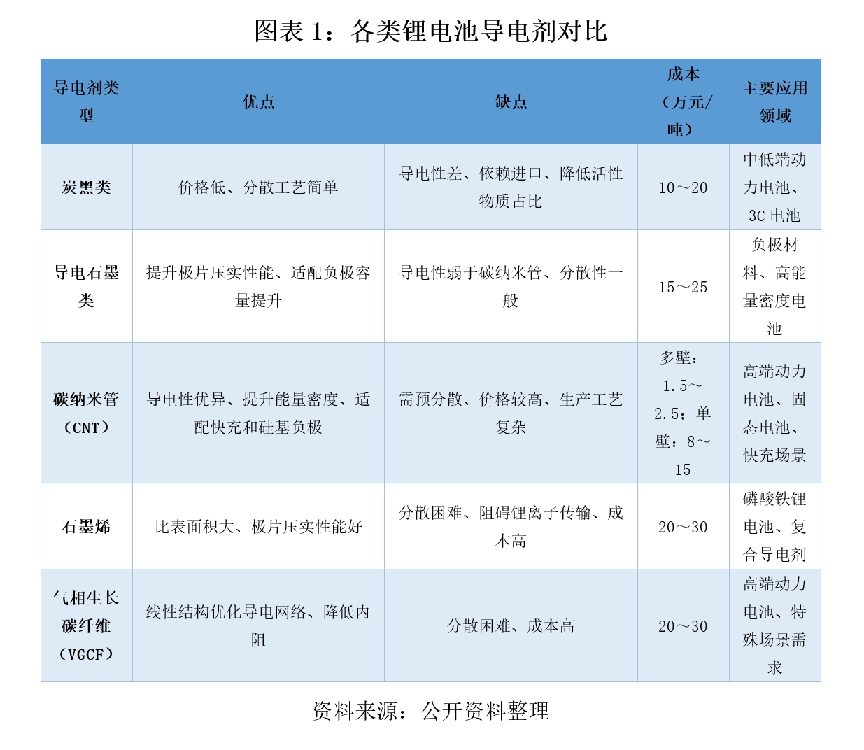 传统导电剂包括炭黑类、导电石墨类、气相生成碳纤维VGCF等,新型导电剂包括碳纳米管、石墨烯等。