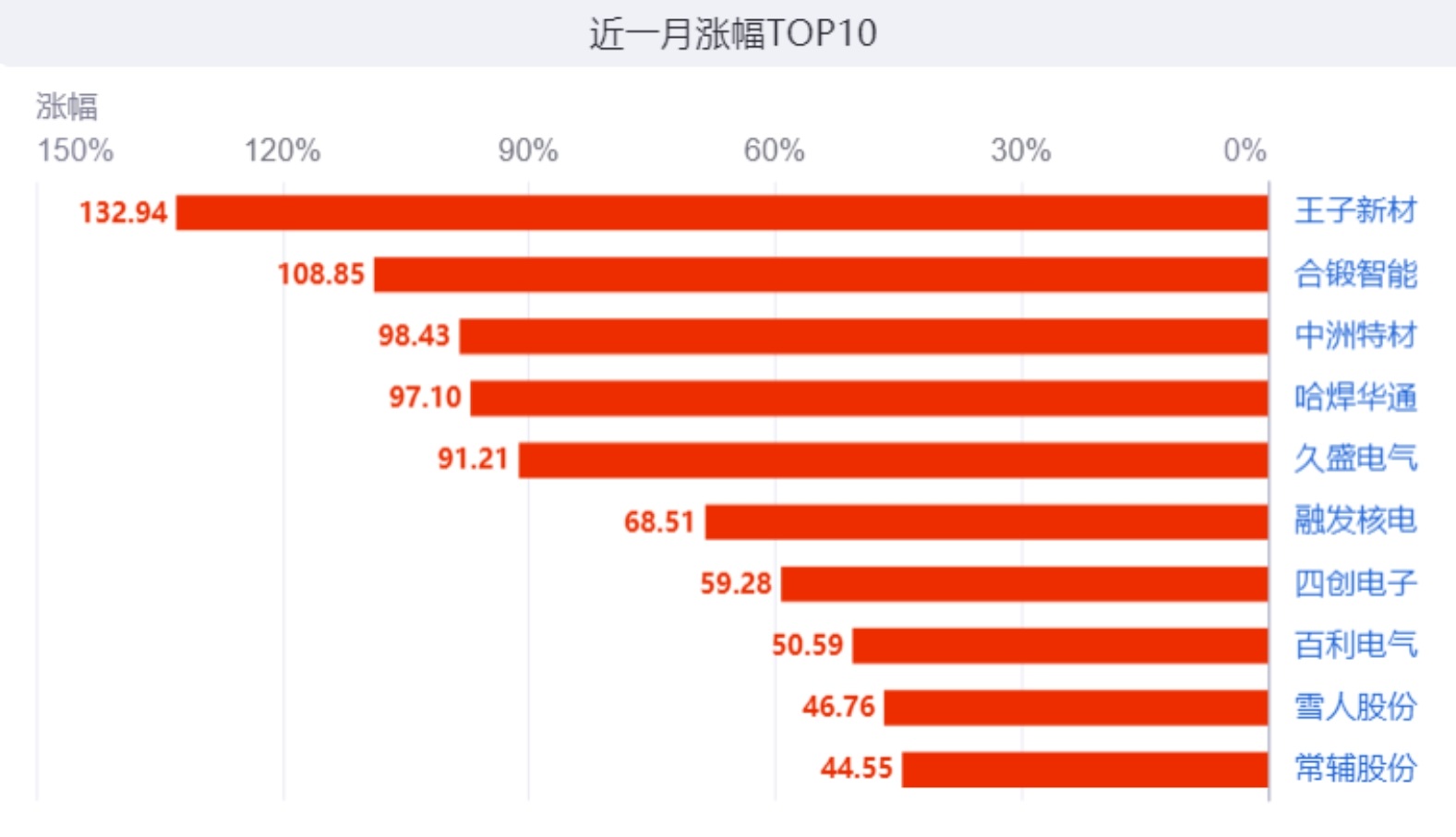 在过去近一个月内,可控核聚变板块内涨幅排名前五的个股分别是,王子新材(132.94%)、合锻智能(108.85%)、中洲特材(98.43%)、哈焊华通(97.10%)、久盛电气(91.21%)。