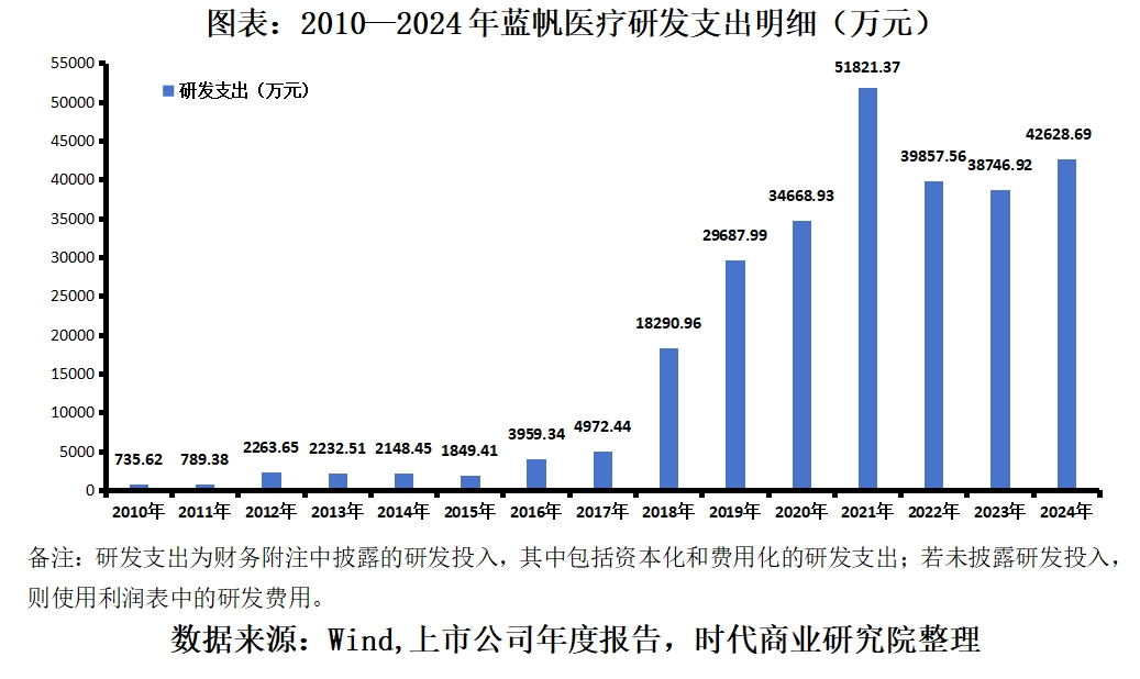 年报显示,蓝帆医疗的研发支出在2018—2021年从1.83亿元逐年增长至5.18亿元,2022—2024年则每年稳定在3.87亿元及以上。