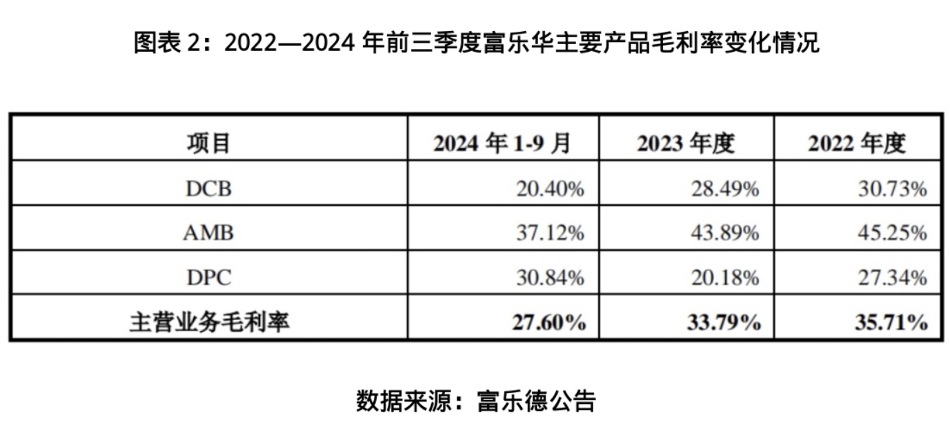 其中,2022—2024年前三季度,DCB产品毛利率从30.73%快速跌至20.40%,主要系市场竞争加剧,富乐华降价获取市场份额所致;同期AMB产品毛利率从45.25%跌至37.12%,则系国内AMB市场处于培育渗透阶段,富乐华为快速拓展和培育市场采取竞争性价格策略,毛利率低于境外市场所致。