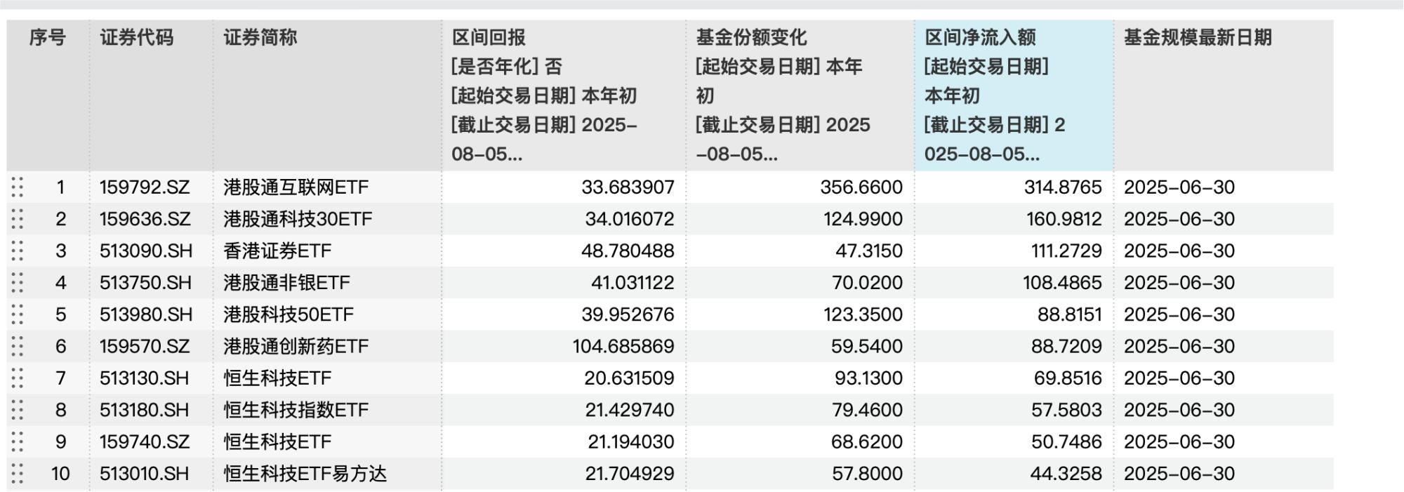 Wind数据显示,截至8月5日净值结算后,年内跨境ETF中港股相关产品实现了规模与净值的双增长。