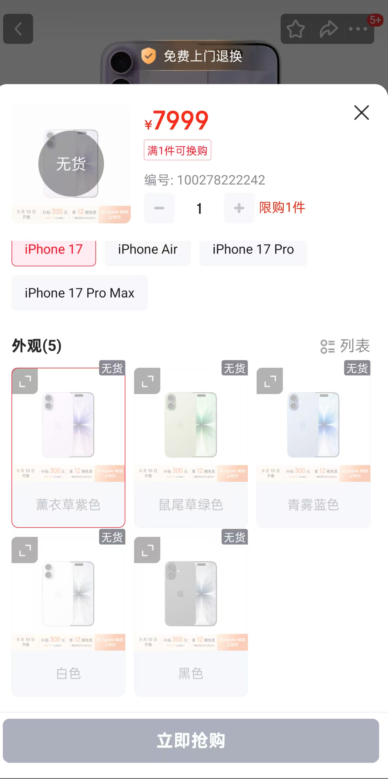 预购开启,苹果官网被挤爆!京东淘宝iPhone17基础版十分钟被抢空,Air版还要等等