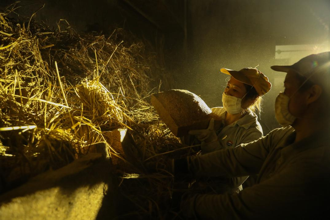 成型的曲块入仓堆积,在温暖潮湿的环境中,霉菌、酵母菌、细菌等各类微生物活跃成长,让曲不再是单一的“催化剂”,而是活着的微生态系统,为后续的发酵注入无限可能。