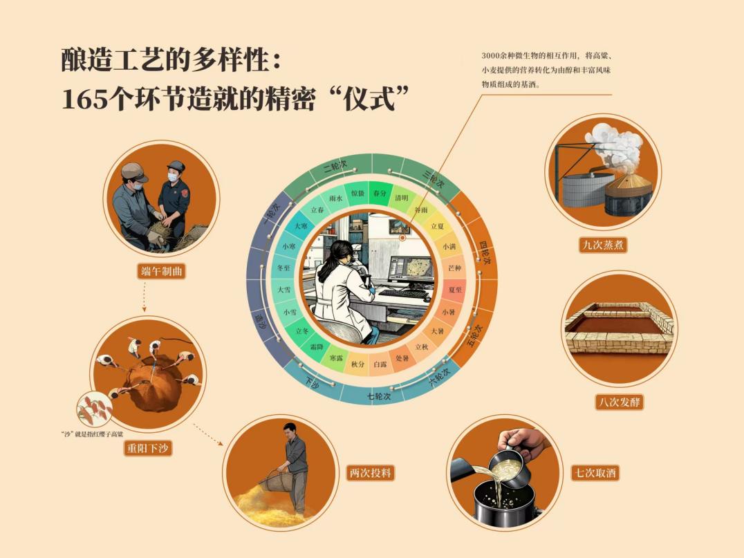 茅台酒酿造的工法体系像一场与自然对话的精妙“仪式”,包含30道工序,165个工艺环节,按“二十四节气”组织制曲、制酒生产。