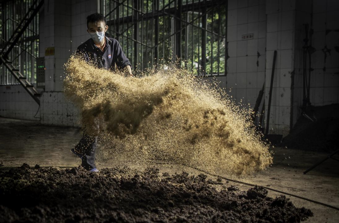 这就是高温制曲。作为茅台的独特工艺之一,高温发酵能够有效对环境中种类繁多的微生物进行筛选,不适宜在高温环境中生存的微生物被淘汰出去,最终留存特殊微生物群。