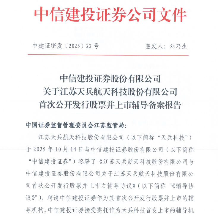 10月17日,证监会官网显示,江苏天兵航天科技股份有限公司(以下简称“天兵科技”)已进行上市辅导备案,辅导机构为中信建投证券。