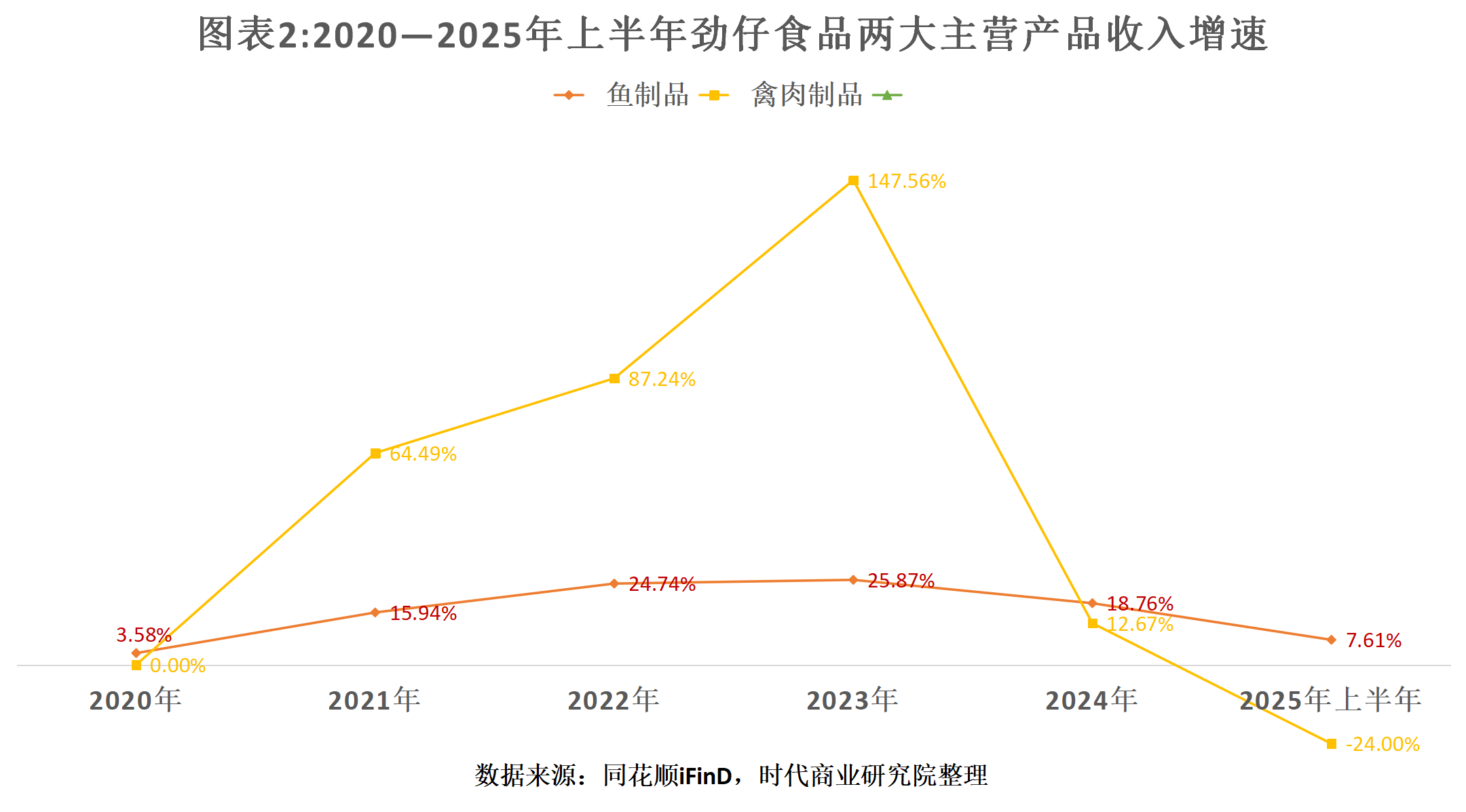 同花顺iFinD数据显示,2023—2024年,劲仔食品禽肉制品收入占比大幅提升到21%左右,成为第二大收入来源。而2025年上半年,其收入占比降至17.45%。