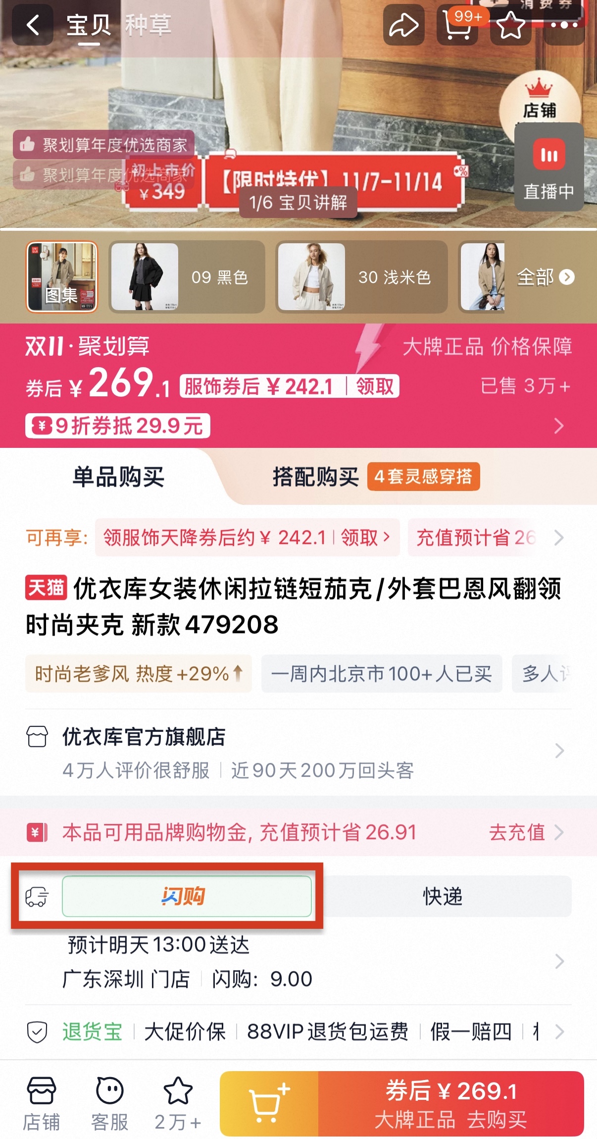 以优衣库为例,消费者在优衣库天猫旗舰店下单时,可以选择“闪购”服务,由距离最近的门店发货,最快半小时送达。天猫双11数据显示,截至11月5日,淘宝闪购带来的新用户在双11期间的电商订单数已超过1亿。