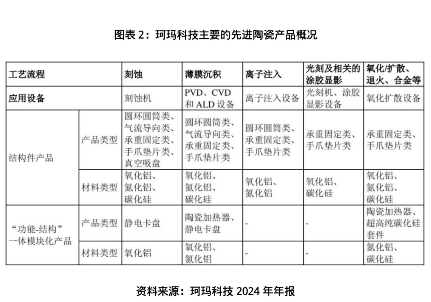 在今年7月的机构调研中,珂玛科技就明确表示,随着先进材料生产基地项目投产,公司将进一步聚焦产品升级,从传统陶瓷结构零部件为主,转向以陶瓷加热器、静电卡盘和超高纯碳化硅套件等“功能—结构”一体模块化产品为核心竞争力,对标国际半导体设备先进陶瓷企业,向国际一流水平的半导体设备关键零部件高技术企业升级转型。