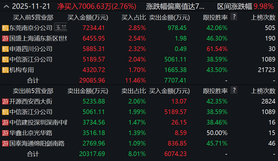 Wind龙虎榜数据显示,11月17日至18日,上榜营业部席位合计净买入1.58亿元。具体来看,机构合计净买入7261.88万元。此外,开源证券西安西大街证券营业部、国泰海通证券上海静安区新闸路证券营业部分别买入8900.35万元、7976.62万元;开源证券西安西大街证券营业部、华泰证券济南解放路证券营业部分别卖出6732.39万元、5854.99万元。