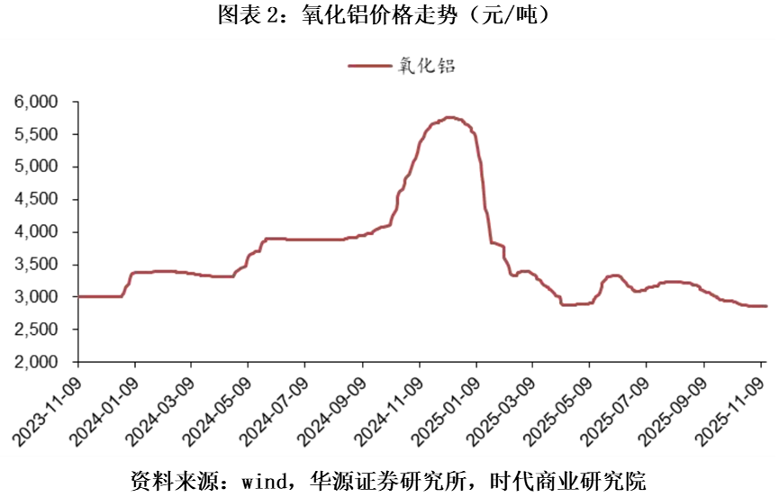 而与电解铝涨价形成巨大反差的是,作为上游原料的氧化铝因新产能释放价格大幅回落。2024年年底,氧化铝现货均价一度升至5127元/吨,2025年10月已回落至约2845元/吨,价格接近腰斩。