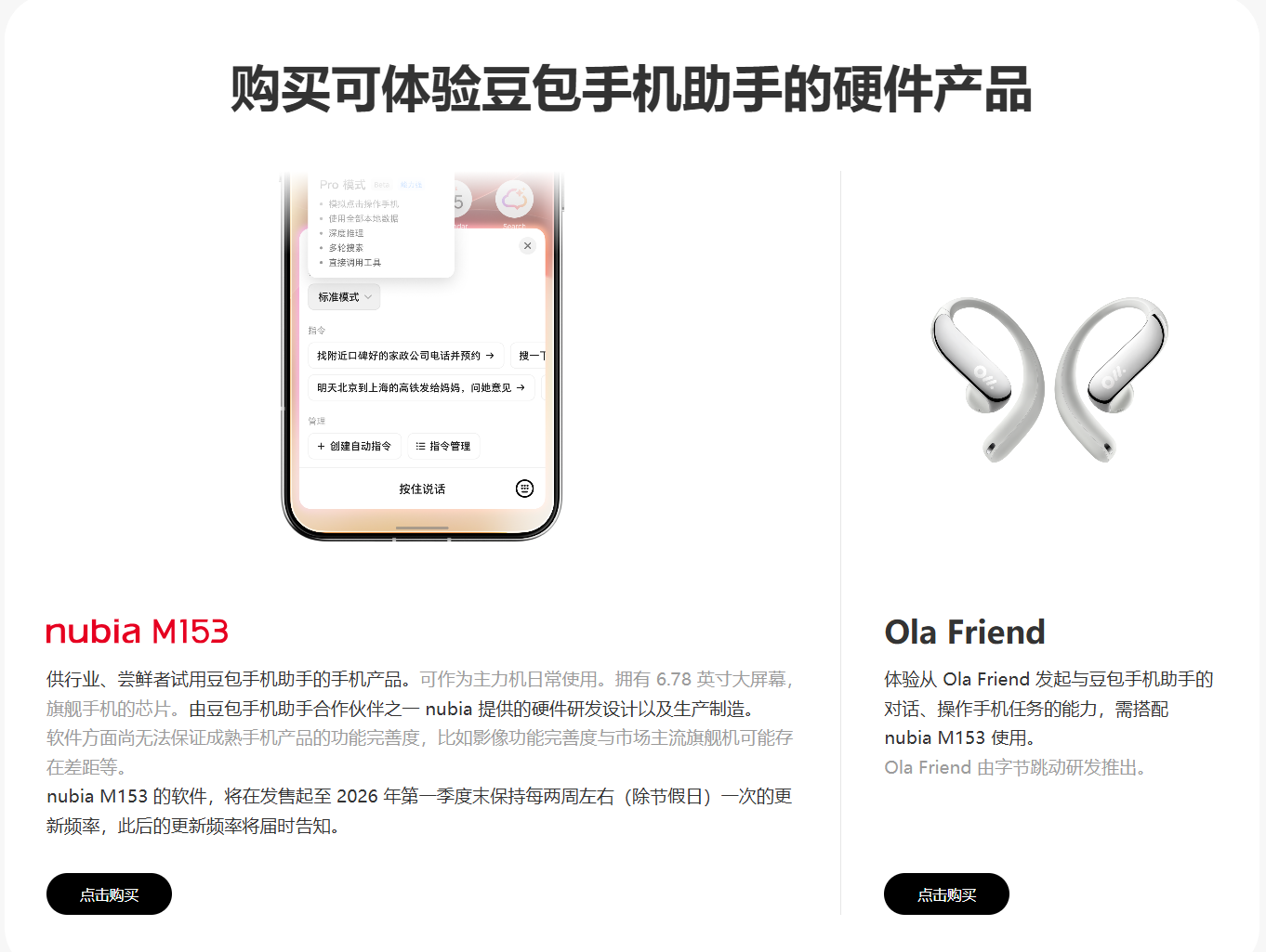进入豆包手机助手官方网站,会发现豆包在nubia M153之外,还展示了另一款硬件产品:Ola Friend耳机。