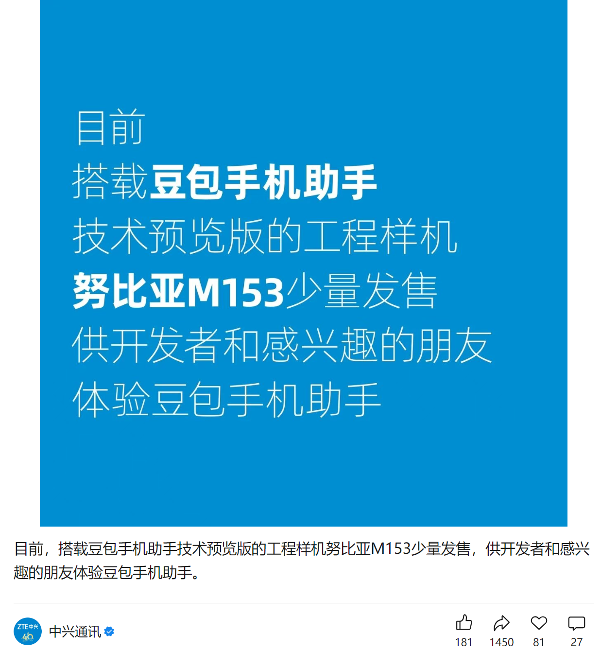 12月1日上午,中兴通讯表示,搭载豆包手机助手技术预览版的工程样机nubia M153少量发售,供开发者和感兴趣的用户体验豆包手机助手。