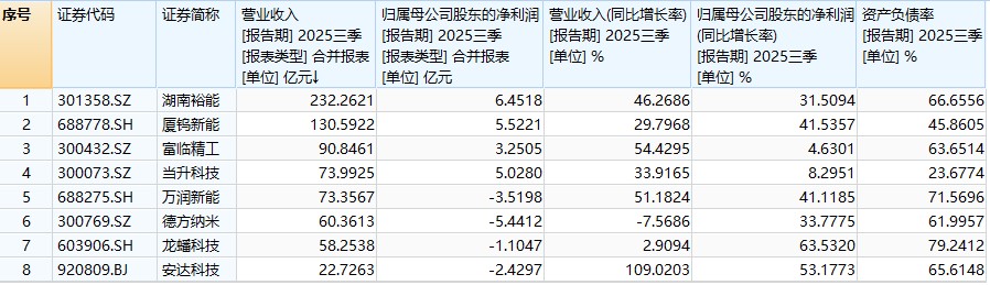 Wind数据显示,从2025年前三季度来看,时代财经梳理的8家磷酸铁锂上市公司中,除了德方纳米(300769.SZ)前三季度营收同比下滑,其余均同比增长,其中安达科技(920809.BJ)、富临精工、万润新能增速超50%;而归母净利润方面,上述企业均同比增长,其中龙蟠科技、安达科技同比增超50%,但有一半企业仍处于亏损状态,产能高负荷的万润新能同比减亏超40%。