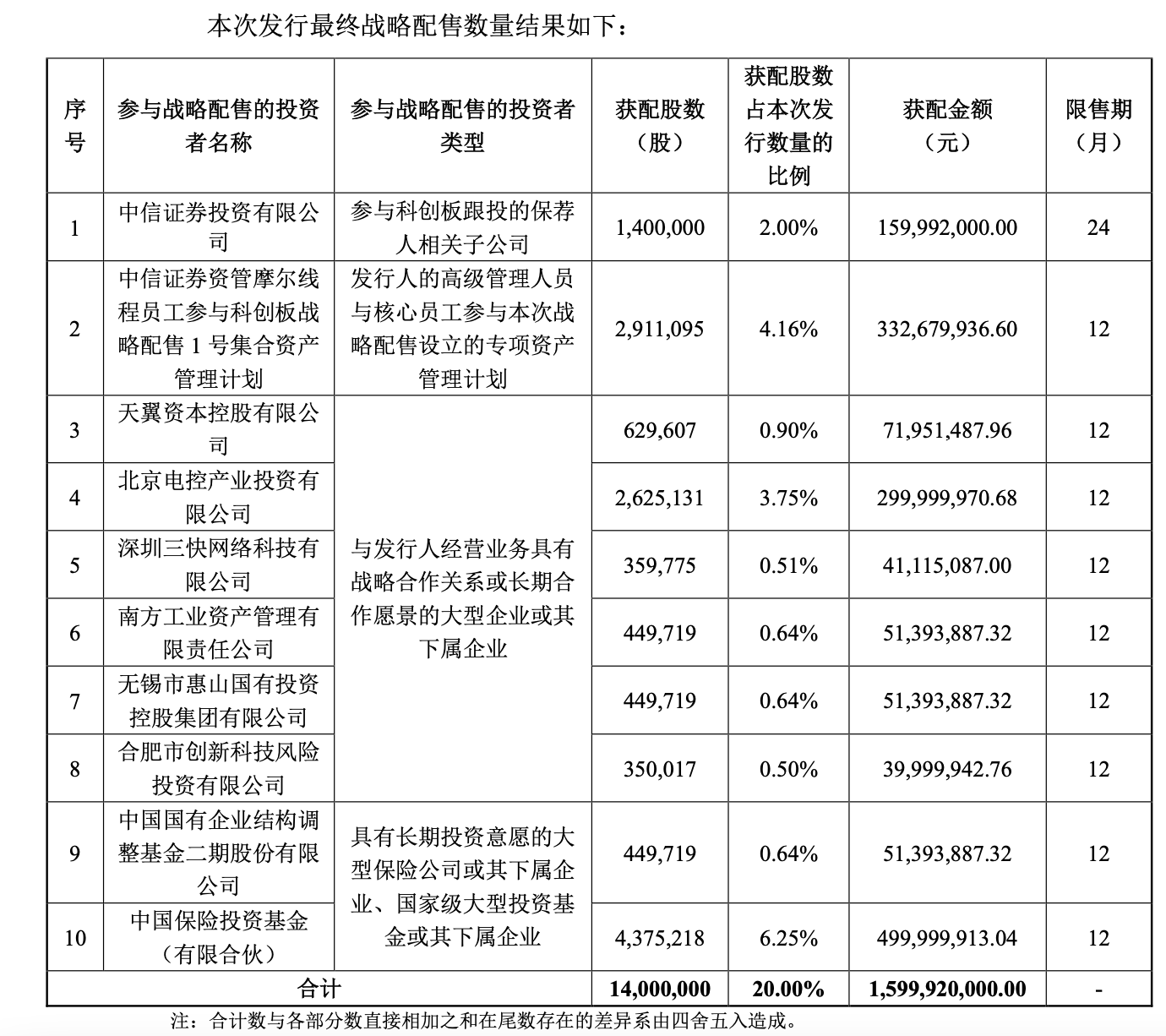 各大机构对摩尔线程的认购热情非常之高。公司披露的发行结果显示,此次发行战略配售数量为1400万股,占本次发行总量的20%,参与方涉及中信证券、中信证券员工资管计划及多家产业资本、国资平台等,如中国保险投资基金(有限合伙)获配5亿元。另外,美团旗下的深圳三快网络科技有限公司、中国电信旗下的天翼资本控股等均获配。