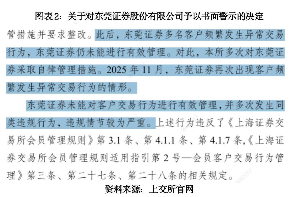 2025年11月,因东莞证券再次未能对客户交易行为进行有效管理,并多次发生同类违规行为,违规情节较为严重,上交所决定对东莞证券予以书面警示。