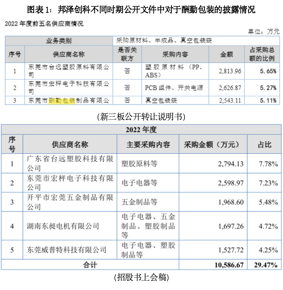 新三板公开转让说明书显示,东莞市酬勤包装制品有限公司(下称“酬勤包装”)为邦泽创科2022年的第三大供应商,采购金额为2521.39万元,采购内容为真空包装袋,占邦泽创科当年采购总额的5.80%。