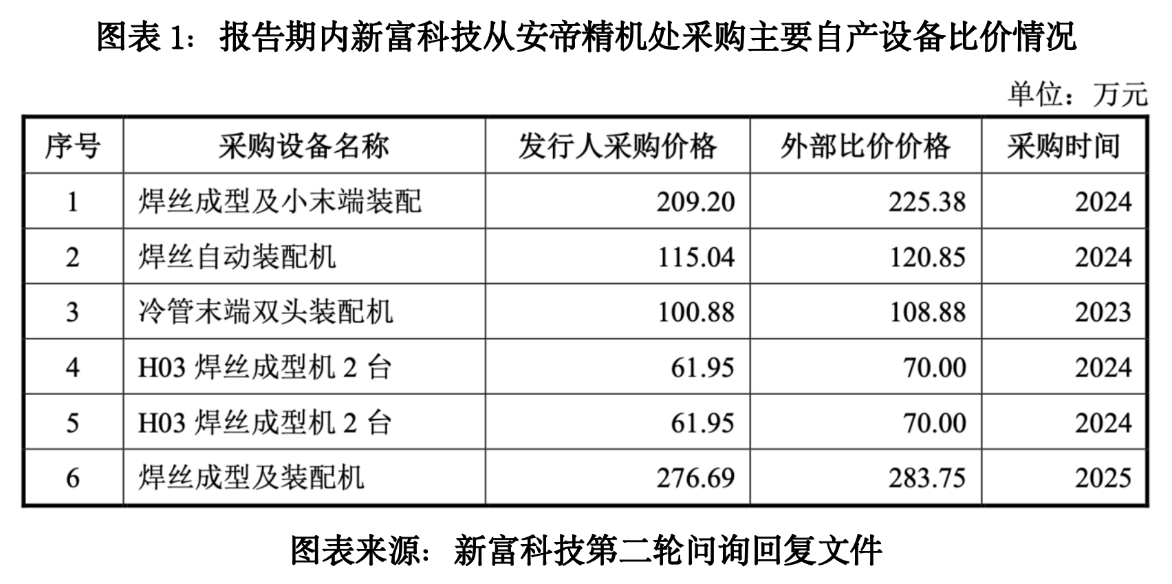 那么,巨额关联采购的定价是否公允?第二轮问询回复文件显示,由于安帝精机向新富科技供应的设备均为根据其特定生产需求定制的专用设备,具有显著的定制化特征,安帝精机不存在相同型号设备同时向该公司与独立第三方销售的情形,无法通过与独立第三方同款设备销售价格直接比价。