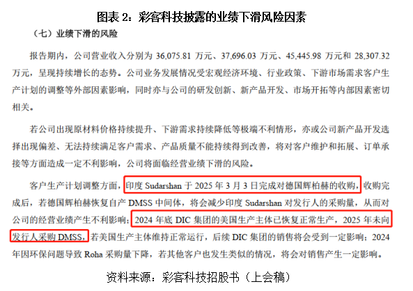 而馅饼能天天掉吗?显然不能。2025年,辉柏赫被印度同行Sudarshan收购,虽然暂时还没恢复自产,但两家企业成了一家,采购策略变不变,谁也说不准。此外,DIC的工厂也修好了,2025年没再向彩客科技下单。彩客科技在招股书里也坦言表示:预测2026年上半年,营收和净利润可能都要下滑,幅度还不小。