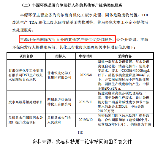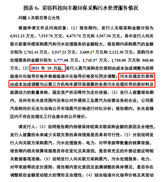 最让人困惑的是污水处理的定价。本来是用“成本加成”法,而2023年10月,突然改成了按一家叫“丰源环保”的第三方机构的测算报告来定价。问题是,彩客科技自己在第二轮问询回复里写明了:“丰源环保未向除彩客科技外的其他客户提供过类似服务”。