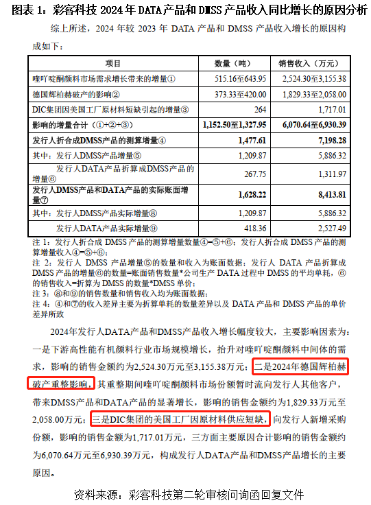 彩客科技在回复监管问询的时候,其实已经交代了底牌。2024年的业绩爆发,最主要推手有三:一是德国颜料巨头辉柏赫(Heubach Colour Pvt Ltd)破产,供应链出现大窟窿,彩客科技通过“补位”捡了不少订单;二是下游市场需求在回暖;三是大客户DIC集团(指日本DIC株式会社及其控制的企业)的美国工厂因原材料供应短缺,临时找彩客科技救急买了大批货。