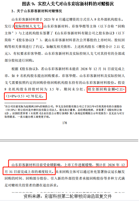 此外,实控人戈弋那边还压着一份对赌协议,如果山东彩客新材料有限公司(以下简称“山东彩客新材料”)无法在2026年底前上市,实际控制人戈弋及关联方可能要掏出将近2.7亿元来回购股份。这么大一笔钱,会不会通过一些隐秘渠道传导到彩客科技来?这也是一个悬在彩客科技头顶上的风险。